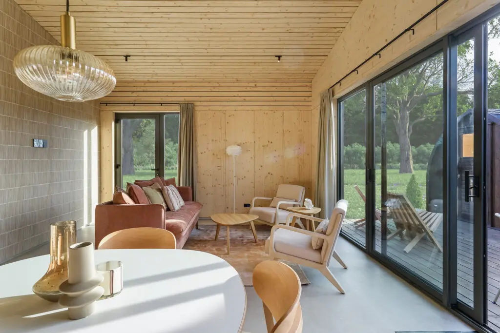 De Nature Homes zijn compact maar stijlvol. Het compacte ontwerp van 34 m² is volledig afgewerkt met natuurlijke houtmaterialen en hoogwaardige vloeren, wanden en keuken. Grote aluminium ramen en schuifdeuren zorgen voor veel daglicht en een sterke verbinding met het terras en de omliggende natuur. De Nature homes zijn uitgerust met privé wellnessfaciliteiten, bestaande uit een hottub en sauna, voor ultiem comfort en luxe.