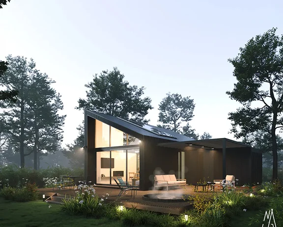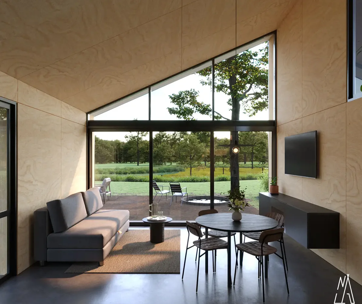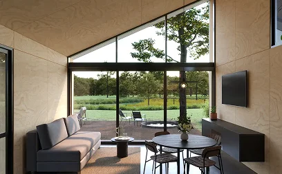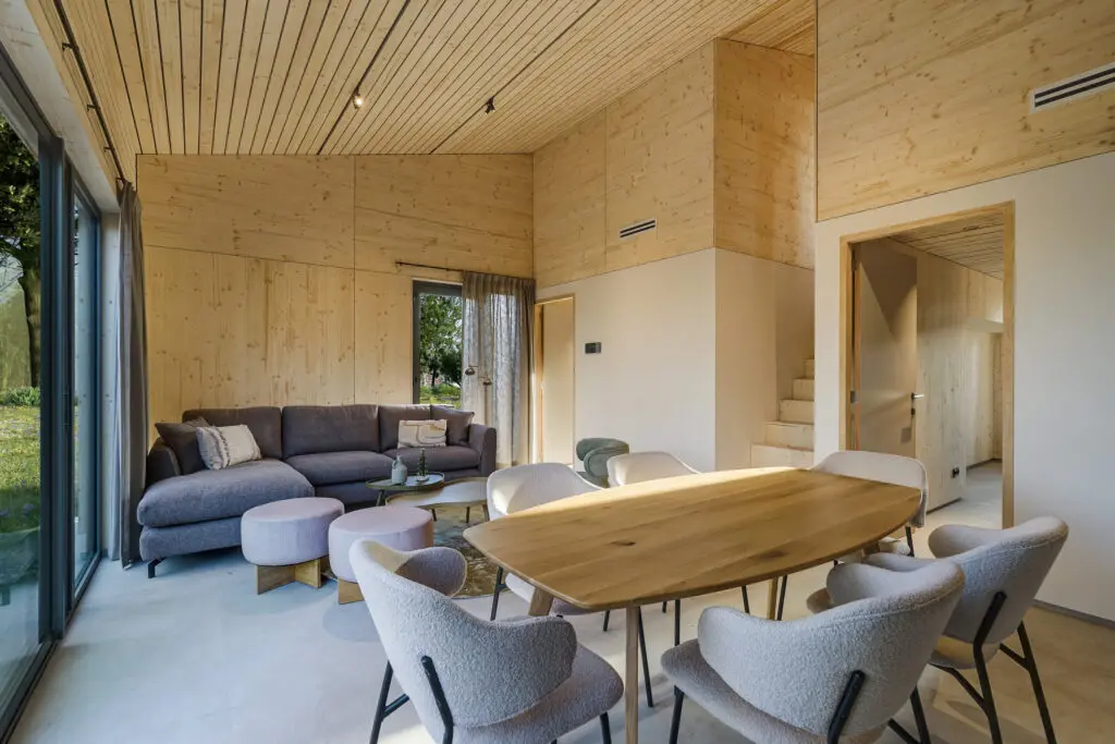 De Bliss-villa is een ruim en licht toevluchtsoord van 101,5 m² verdeeld over twee verdiepingen, met hoge plafonds en oversized ramen die panoramisch uitzicht bieden op de bosrijke omgeving. Het open-plan ontwerp creëert een gevoel van ruimte en vrijheid, ideaal voor groepen die samen willen ontspannen.