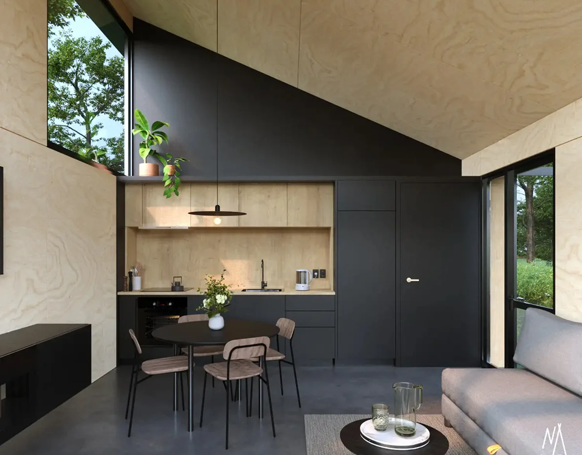 Het interieur combineert natuurlijke houtmaterialen, luxe vloeren en een moderne, volledig uitgeruste keuken tot een warme en uitnodigende leefomgeving. Dankzij de grote ramen en het open-plan ontwerp vloeit het licht naar binnen en ontstaat een harmonieuze verbinding met het terras en de omliggende natuur, waardoor een rustgevende en inspirerende sfeer wordt gecreëerd.