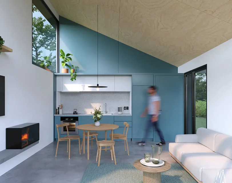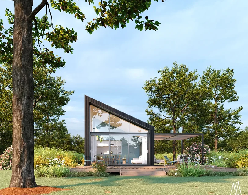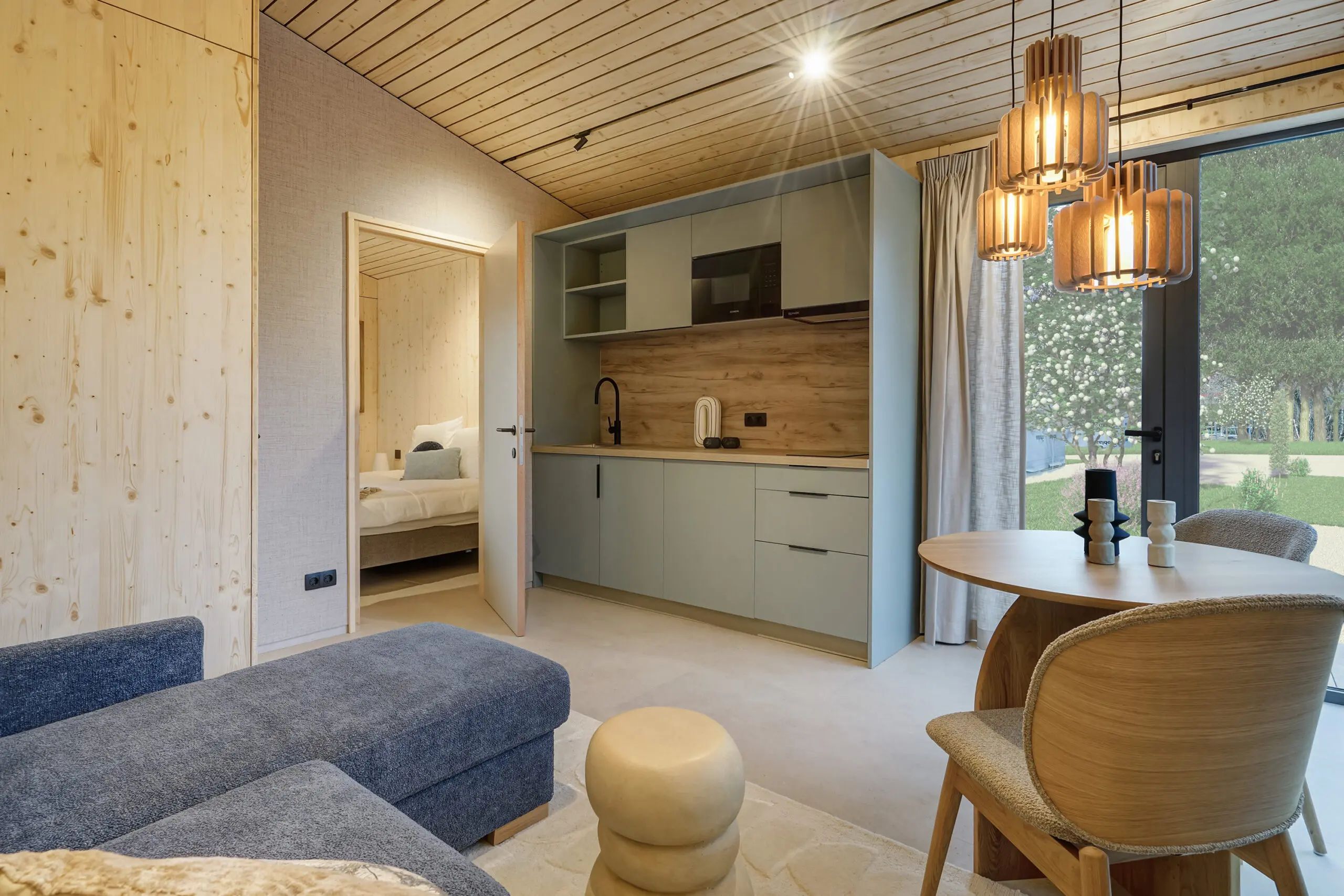 De Nature Homes zijn volledig instapklaar opgeleverd en bieden een slim ontworpen open-plan van 33,8 m². Hoge plafonds en grote aluminium ramen en schuifdeuren zorgen voor maximale lichtinval en verbinden het interieur naadloos met het terras en de bosrijke omgeving. De woningen zijn afgewerkt met hoogwaardige natuurlijke houtmaterialen en een complete, moderne keuken voor een stijlvolle en warme uitstraling.