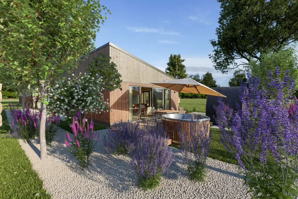 De villa beschikt over twee slaapkamers met comfortabele kingsize bedden en twee ruime badkamers van 3,5 m². Voor ultiem ontspanningscomfort zijn er privé wellnessfaciliteiten aanwezig: een natuur sauna en een hottub, beide harmonieus afgewerkt in hout.