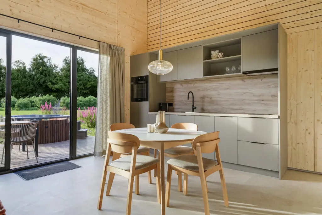 De ruime open keuken en woonkamer zijn ontworpen om koken, ontspannen en samen zijn naadloos te combineren. Dankzij de grote ramen valt het daglicht royaal naar binnen en geniet je van uitzicht op het bos terwijl je kookt of ontspant.