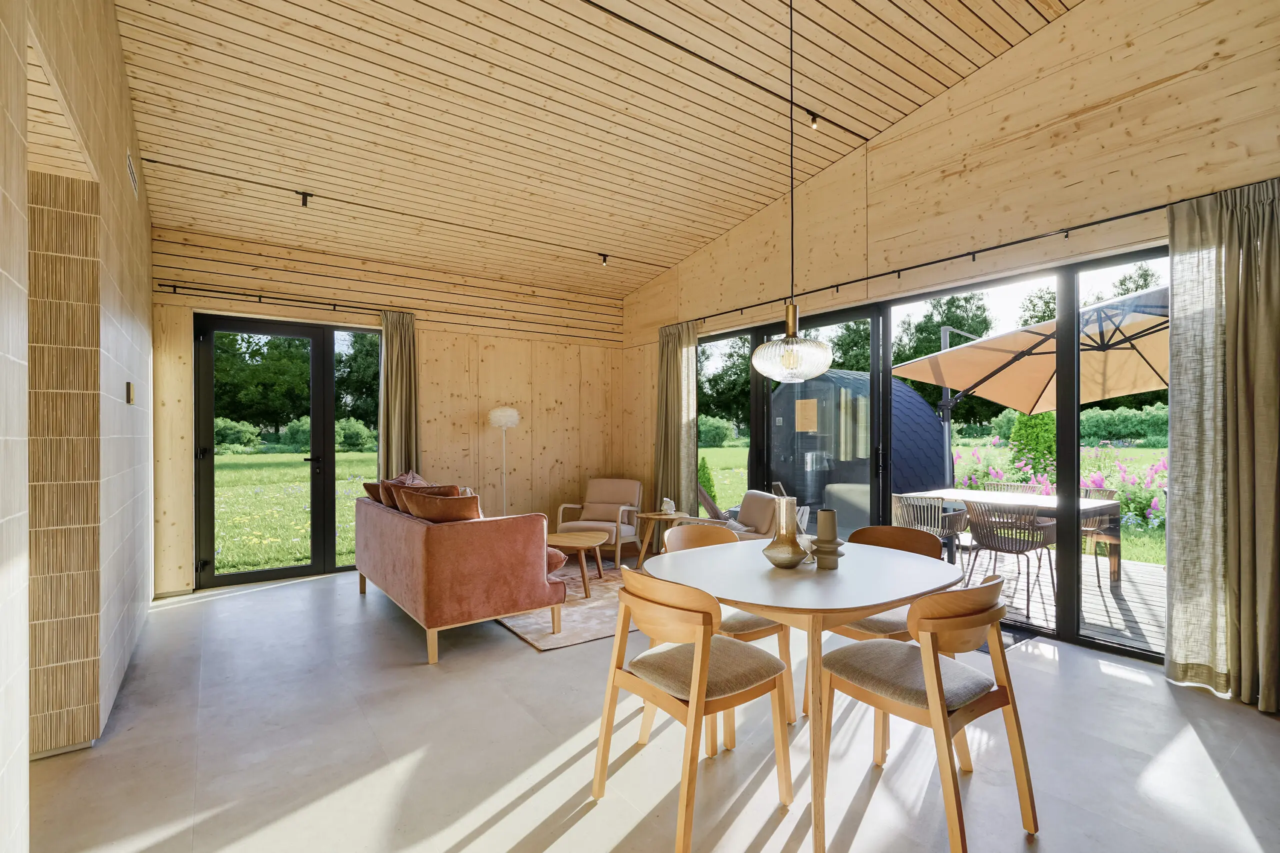 Het open-plan ontwerp en de directe verbinding met het ruime terras laten de omliggende bosrijke omgeving naadloos in het interieur overvloeien. De woning combineert esthetiek met functionele elegantie, ideaal voor koppels die rust en comfort zoeken.